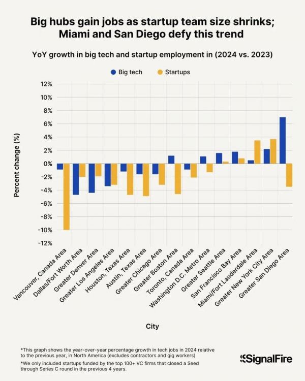 与德州的降温形成鲜明对比的是,迈阿密和圣地亚哥等城市正在快速崛起。这两个城市正在吸引科技人才,不是靠巨额预算,而是靠阳光、生活方式和较低的生活成本。迈阿密的税收优惠和生活质量的结合推动了 AI 职位 12% 的增长。圣地亚哥的大型科技公司职位增长了 7%,尽管该地区的初创公司在 2024 年失去了 3.5% 的劳动力,这表明人才正在向上流动。有趣的是,2024 年圣地亚哥县的初创公司筹集了 57 亿美元的风险投资,标志着该地区历史上表现最好的年份之一。