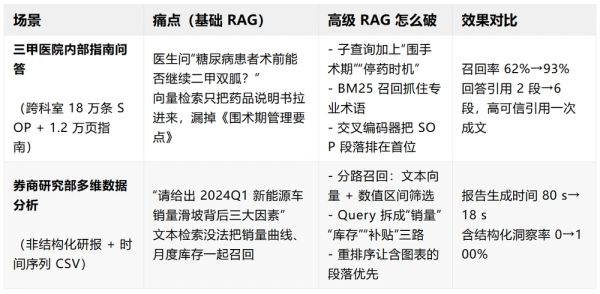 传统 RAG 只用向量 Top-k 检索,常常会漏掉专业术语或编号;高级 RAG 可以同时跑向量、关键词、结构化数据等多路召回,再用轻量模型二次排序,把真正相关的段落放到最前。