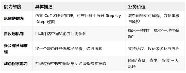 如果说 GraphRAG 可以把资料“织成网”,那推理型 RAG 就是在网里塞进一位能“拆题-找料-论证-拍板”的小型决策官。它将思维链推理与检索动态调度融合,直接面向“复杂思考+自主决策”场景。