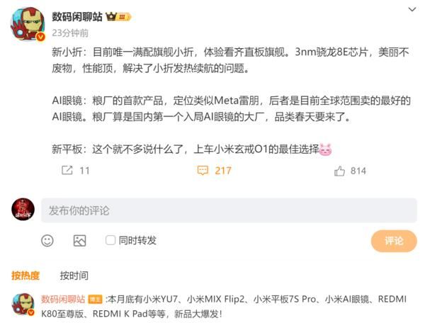 该博主称,本月底有小米YU7、小米MIX Flip2、小米平板7S Pro、小米AI眼镜、REDMI K80至尊版、REDMI K Pad等等,新品大爆发!该博主称,小米MIX Flip2目前唯一满配旗舰小折叠,体验看齐直板旗舰。搭载3nm骁龙8至尊版移动平台,性能非常顶,并且解决了小折发热续航的问题。