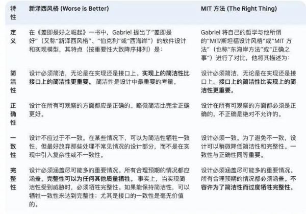 首先构建一个跨平台、资源消耗低的基本实现; 把这个“次优解”快速推向用户; 在广泛采用的基础上,持续增强功能和性能。“Worse is Better”的提出者 Gabriel(Richard P. Gabriel,1949 年出生,美国计算机科学家,以在 Lisp 编程语言方面的贡献闻名)其实也并未否定 MIT 派的“正确主义”理念。他指出,这种模式更适合构建庞大复杂的单体系统,或像钻石般精致的小型系统。然而,这类系统往往需要漫长的设计周期和强大的硬件资源,难以在早期计算资源有限的时代广泛推广。