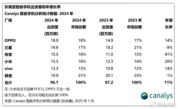 小米则以16%的市场份额位居东南亚智能手机年出货量第4名,年出货量约1550万部。小米以其高性价比的产品策略在东南亚市场迅速打开局面;传音在东南亚智能手机市场同样表现出色,以16%的市场份额排名第3,年增长率更是达到41%,成为增长最为迅猛的品牌。传音在非洲市场取得了巨大成功后,将成功的经验复制到了东南亚市场。