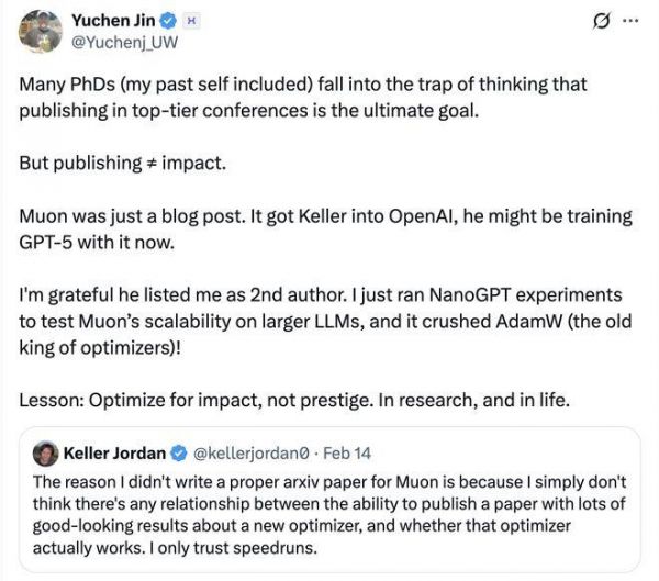 “许多博士(包括以前的我)都陷入了这样一个误区:认为在顶级会议上发表论文才是最终目标。但发表论文≠影响力。Muon只作为一篇博客文章发布,它让Keller加入了OpenAI,他现在可能正在用它训练GPT-5。”Yuchen Jin说。
