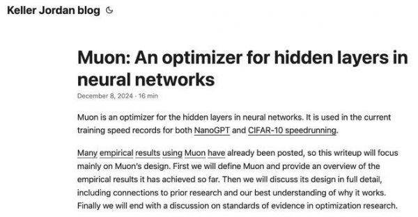 ▲Yuchen Jin的X推文及Yuchen Jin的自述Yuchen Jin提及的这篇博客发布于2024年12月,题为《Muon:神经网络隐藏层的优化器(Muon: An optimizer for hidden layers in neural networks)》。