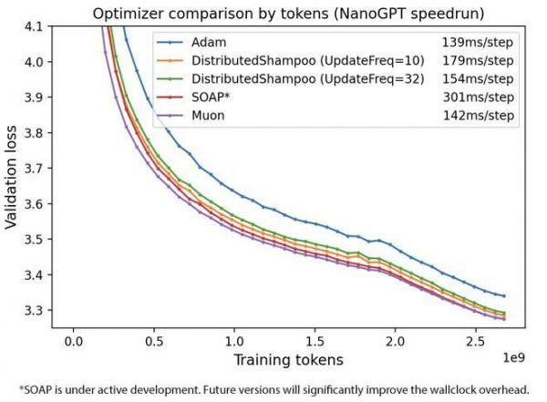▲按样本效率比较优化器(可复现日志:https://github.com/KellerJordan/modded-nanogpt/tree/master/records/102924_Optimizers)