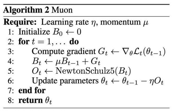Muon通过采用SGD-momentum生成的更新来优化二维神经网络参数,然后在将它们应用于参数之前,对每个更新应用 Newton-Schulz (牛顿-舒尔茨迭代法,简称NS)迭代作为后处理步骤。