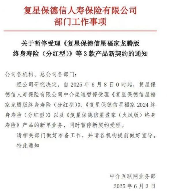 无独有偶。自2025年6月8日0时起,复星保德信人寿保险中介渠道已暂停受理复星保德信星福家龙腾版终身寿险 (分红型)、复星保德信星福家2024 终身寿险(分红型),以及复星保德信星盈家(火凤版) 终身寿险产品的新单业务,同时暂停新契约受理。