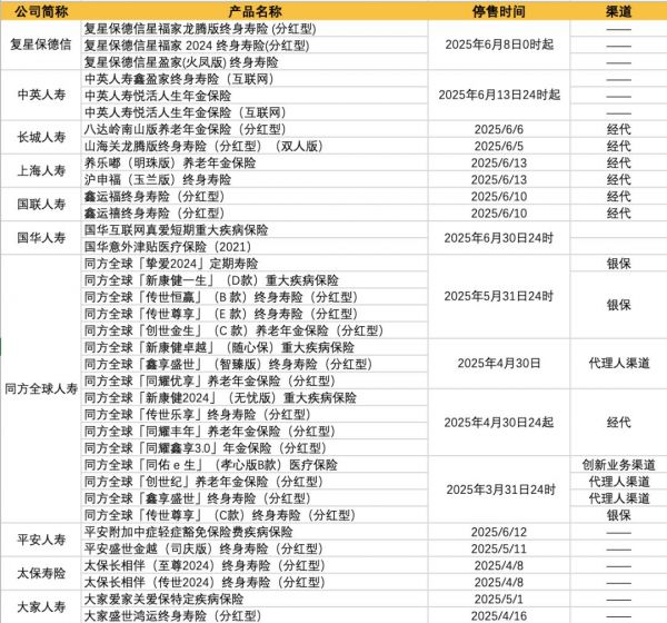 自2025年6月1日起,同方全球人寿已在银保渠道停止销售「挚爱 2024」定期寿险、「创世金生」(C款)养老年金保险(分红型)、「传世尊享」(E款)终身寿险(分红型)等6款产品。