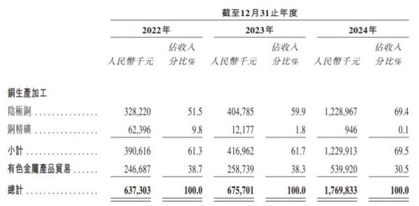 金浔股份的收入主要来自生产及销售阴极铜、铜精矿、买卖多种有色金属产品。2022年、2023年、2024年(简称“报告期”),铜生产加工的收入占相应年度总收入的60%以上,占比较大。