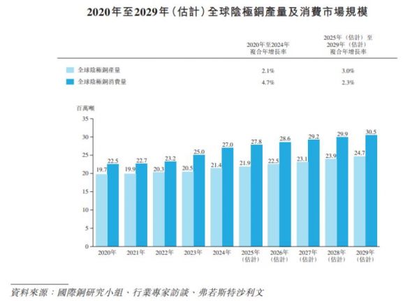 2020年至2024年,全球阴极铜产量从1970万吨增至2140万吨,同期全球阴极铜消费从2250万吨增至2700万吨。预计2025年至2029年全球阴极铜消费量将以2.3%的复合年增长率增长,到2029年达到3050万吨。