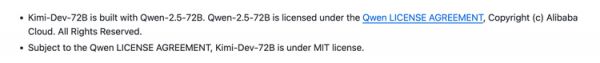 但同时,月之暗面也在文档中明确说明:“Kimi-Dev-72B is built with Qwen-2.5-72B.Qwen-2.5-72B is licensed under the Qwen LICENSE AGREEMENT,Copyright(c)Alibaba Cloud.All Rights Reserved.Subject to the Qwen LICENSE AGREEMENT,Kimi-Dev-72B is under MIT license”。