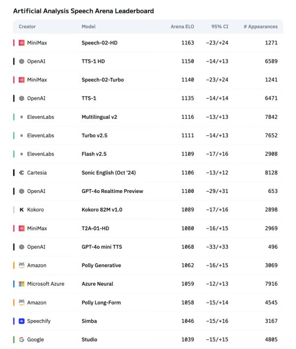 MiniMax语音模型Speech-02-HD位列Artificial Analysis Speech Arena榜单第一