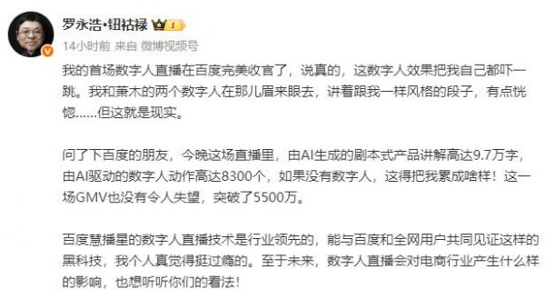 同时我们也注意到,百度电商与罗永浩合作的数字人直播,并不只是一次面向行业的“秀肌肉”,而是真正能够将技术升级的红利普惠给广大商家——不仅可复制,而且低门槛。