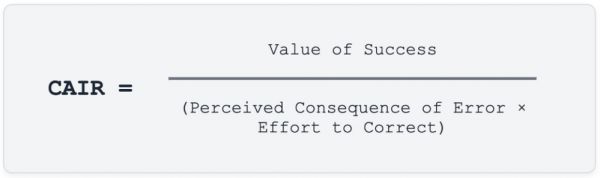 他发现,用户采用AI产品最大的障碍其实是恐惧。要获得最大的采用率,你需要降低恐惧并提高信心。我们需要一个可以优化的信心指标,这就是CAIR发挥作用的地方。CAIR通过一个简单的关系来衡量用户信心,它平衡了用户获得的价值与他们面临的心理障碍。这个公式是:CAIR = 价值 ÷ (风险 × 纠正成本)。