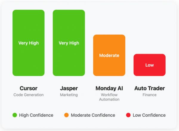 在代码和创意工具领域,我们看到高CAIR的一致模式。像Cursor这样的编程工具和像Jasper这样的写作助手都表现出高价值、低风险、低纠正成本的特征。这些工具的成功秘诀在于它们创造了一个“试错成本极低”的环境。用户可以轻松地生成、评估、修改或丢弃AI输出,整个过程感觉更像是与一个非常快速的助手协作,而不是将重要决策委托给一个不可控的系统。