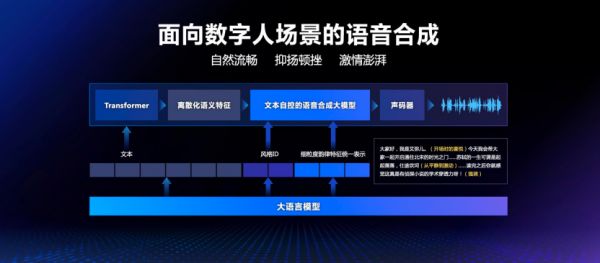 通过文本自控的语音合成大模型的,实现高复原的语音合成能力,再结合直播台词及发音人特征,合成风格适当、自然流畅的声音。
