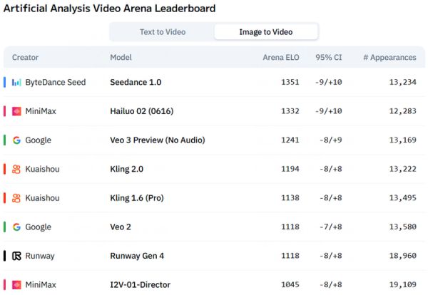 在全新架构的加持下Hailuo 02在Artificial Analysis Video Arena的Image-to-Video榜单位列全球第二,仅次于字节的Seedance 1.0,已把Google Veo 3、可灵2.0甩在身后。