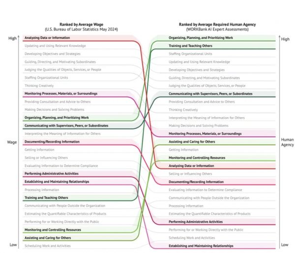 结果显示了一种深刻的价值倒置。“分析数据或信息”——目前平均工资最高的技能——在需要高人类参与度的任务中排名仅第17位。