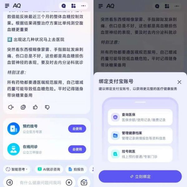 值得注意的是,当AQ回答完成问题后,会在下方显示预约挂号和在线问诊等服务,该服务需绑定支付宝账号,实现从问题咨询到医疗服务的一站式健康管理的闭环。