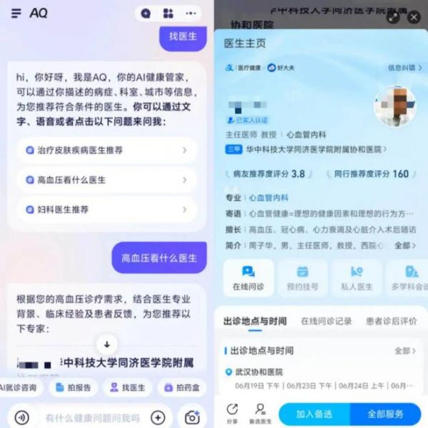 最后,则是“找医生”功能。该功能建议开启定位功能,譬如,输入“高血压看什么医生”时,AQ会结合医生专业背景、临床经验及患者反馈等维度,推荐几位本地的医生,并会附上推荐医生的在线咨询的入口。点击入口,用户可查看医生详细信息、问诊记录与患者评价,直接在 AQ 内完成预约挂号、在线问诊等全流程操作。