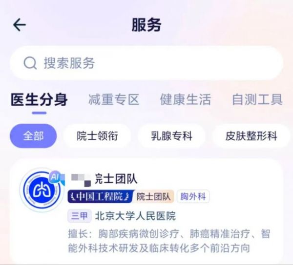 除了上述的主要服务外,AQ还有一个医疗健康智能体相关的服务专区,包括医生分身、减重专区、健康生活、自测工具等。特别是医生分身, 通过对名医的专业知识以及丰富临床经验的模拟与训练,打造出一个智能体,能够7×24小时无间断地为用户进行AI咨询和就业服务。