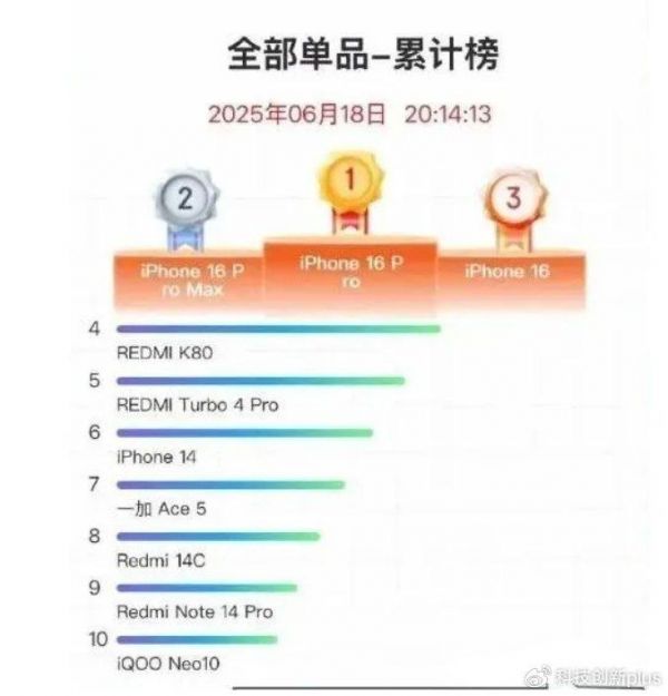 上图是JD的手机销量总榜,可以看到小米一共上榜4台,数量第一,这4款分别是排在在4、5、8、9位,只比苹果差一些了,国产最强。