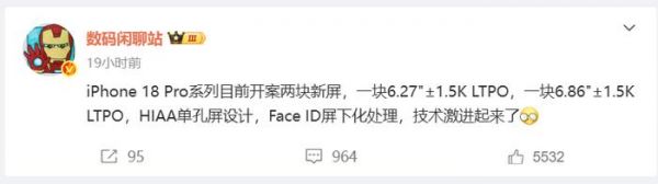 图源:微博截图据透露,这两款屏幕尺寸分别为 6.27 英寸和 6.86 英寸,均采用 1.5K 分辨率的 LTPO 面板,结合前面提到的两款新型屏幕技术,iPhone 18 Pro 系列怕是会成为苹果史上第一款单孔屏手机。