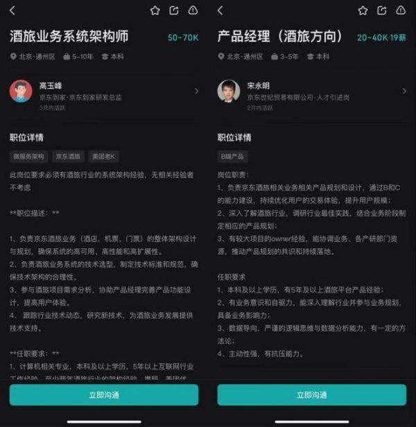 除此之外,3月起,京东在招聘小程序发布专门面向"酒旅行业"的招聘信息,涵盖产品经理、后端开发、航空运营、运营等多个岗位。比如产品经理岗要求有5年以上酒旅平台产品经验,开出薪资20-40k。酒旅业务系统架构师要求有2年以上酒旅行业架构经验,并特意标注携程、美团优先,有某块业务技术架构从0到1搭建经验者优先,开出薪资50-70k。