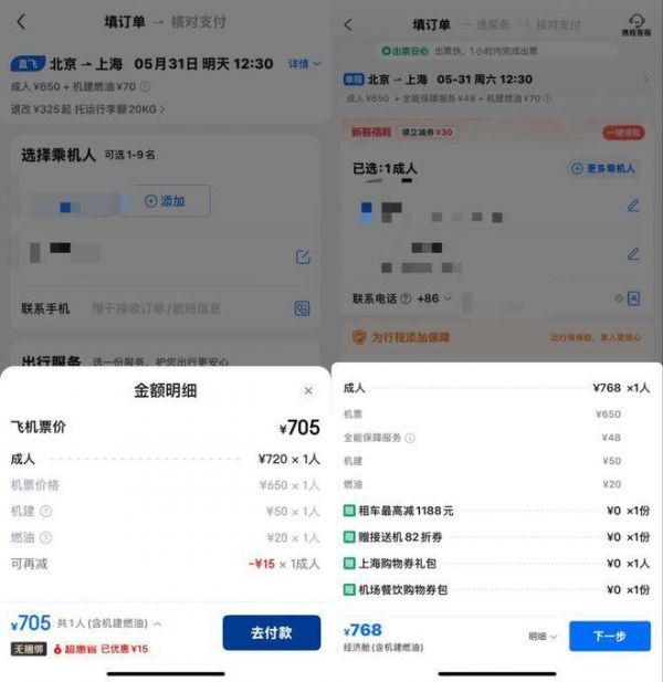 壹览商业搜索发现,通过京东APP首页-生活旅行-酒店/机票按钮即可到达上图页面,页面主页显示"机票查询·无捆绑",所有机票都打上了"无捆绑"标识。以5月31日中午12点30分中国航空北京-上海航线为例,同是标价650元的机票,携程最终总价768,京东705。差价源于携程价值48元的"全能保障服务"以及京东的15元补贴。
