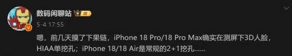 该消息随后便得到了知名博主数码闲聊站的确认,他表示苹果iPhone 18 Pro系列机型“确实在测屏下3D人脸,采用HIAA单挖孔”。