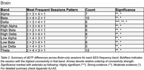 其中,大脑组的神经活动最为活跃,思考、组织与执行能力都得到了很大强度的锻炼;搜索引擎组居中,而AI组的脑电波整体偏弱,且注意力也都在随着时间持续下降。