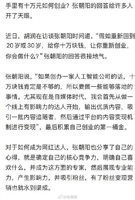 10万元重新创业会怎么做?张朝阳:会从线上网红开始做起,展现自己的独特再用流量变现。