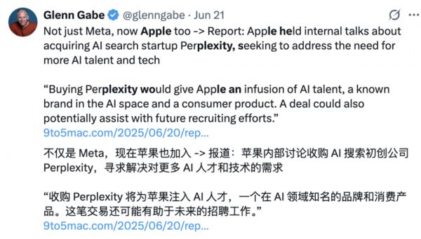 但在过去几个月中,苹果与Perplexity会面了多次。对于这一消息,双方目前(6月23日)都没有作出回应。