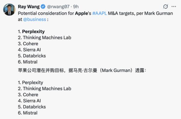 除了Perplexity,据马克·古尔曼(Mark Gurman)爆料,还有很多AI公司在苹果的潜在目标清单里: