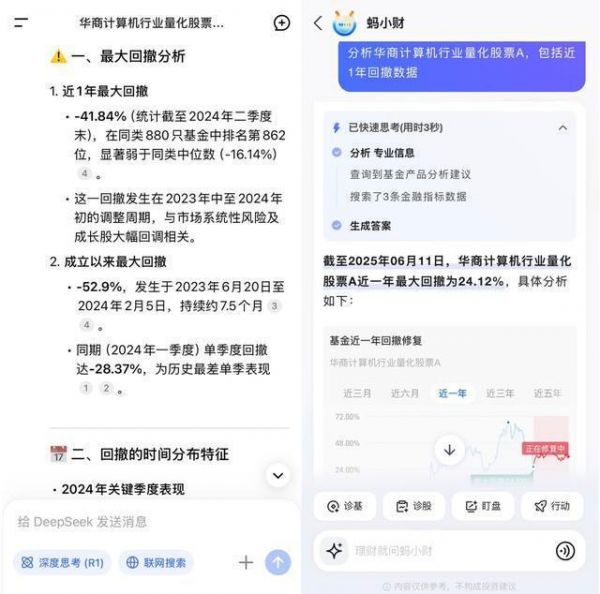 即便强大如DeepSeek,遇到金融专业问题也会显得相形见绌。比如询问某只基金近一年的回撤数据时,DeepSeek展示的近1年时间范围为“2023年中至2024年初”,数据更新滞后。而蚂小财提供了截至2025年6月最新的回撤数据,相对更加准确及时。