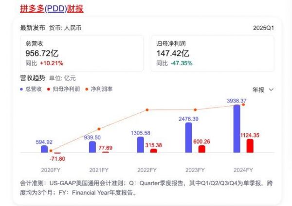 再到2025年Q1,拼多多营收956.7亿元,同比增长10%,净利润却同比暴跌47%,营收环比下降13.5%,创三年来最大降幅。