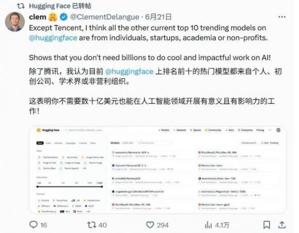 HuggingFace CEO 的贴文似乎印证了这句话。