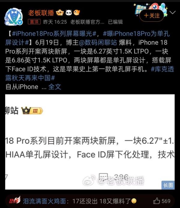 最新消息称,iPhone 18 Pro屏幕形态大变,不再是灵动岛感叹号,其中方案之一就是要换上小挖孔前置了,说白了就是换上了安卓使用多年的单挖孔屏幕形态。