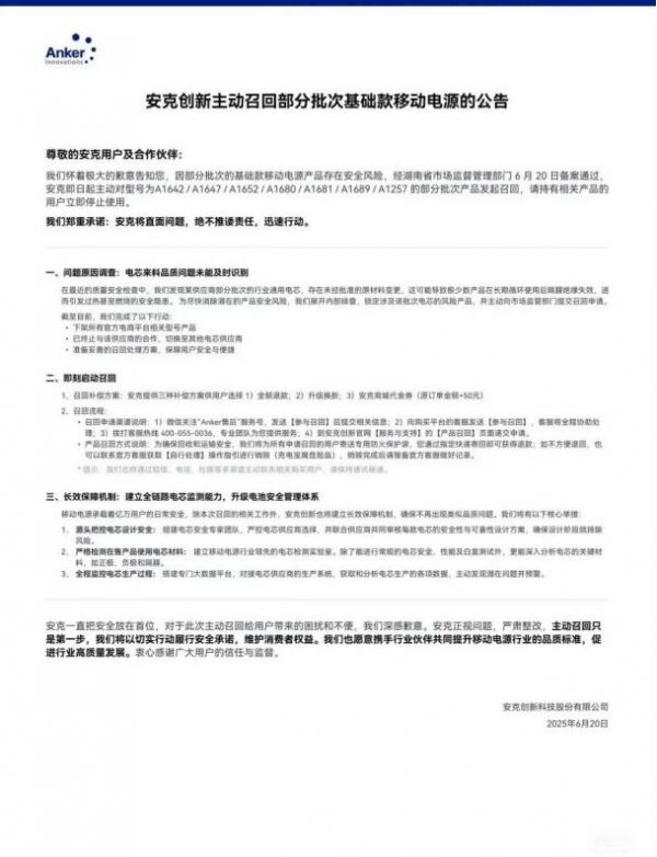罗马仕之后,安克创新主动召回部分批次移动电源(型号A1642等),而绿联、倍思等品牌的移动电源3C证书同步被暂停,市场主流产品一夜退场。