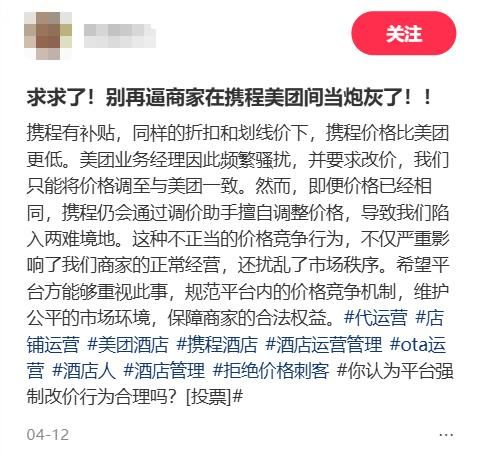 在这个过程中,大林没有能力阻止,电话打给美团,被告知无法退出调价,而携程合同默认接受调价,不管大林怎么努力,只能眼睁睁看着价格螺旋下跌。