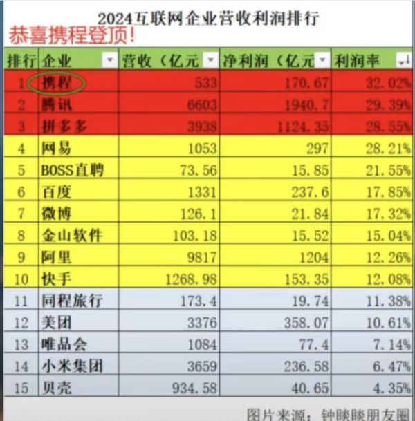 排名第一的是携程,在一众互联网公司中,以唯一超30%利润率数据登顶“王座”。