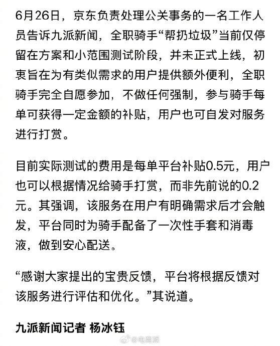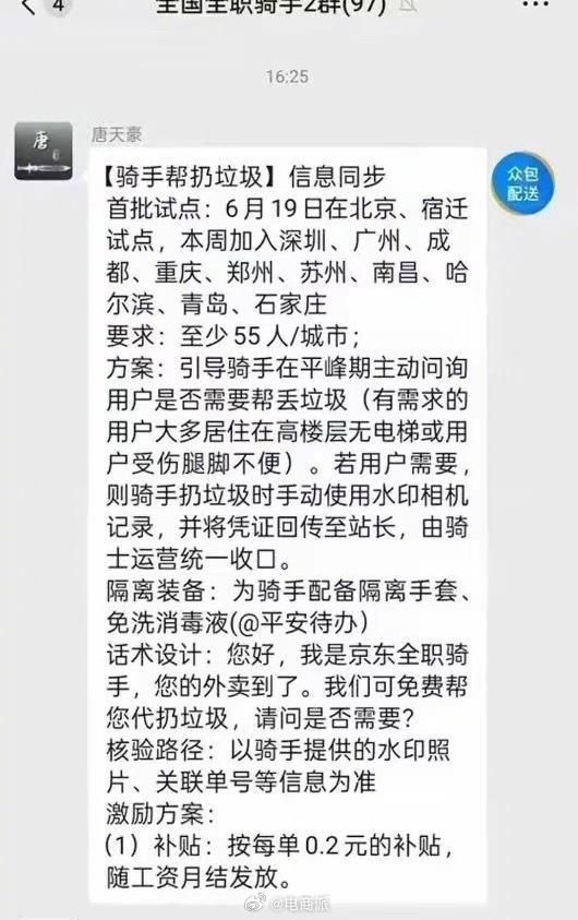 京东外卖试点骑手帮扔垃圾,每单补贴五毛