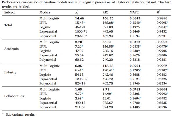 在实验中,我们首先在AI著名系统历史统计数据集上验证了多逻辑斯蒂增长模型的可行性。该数据集记录了自1950年代以来每年在AI领域开发的著名系统的累计数量。该数据集包含四个主要类别,即总体、学术界、工业界和产学研合作。与多个数学模型对比,多个评估指标验证了多逻辑斯蒂模型能更好地拟合AI技术的历史发展趋势。