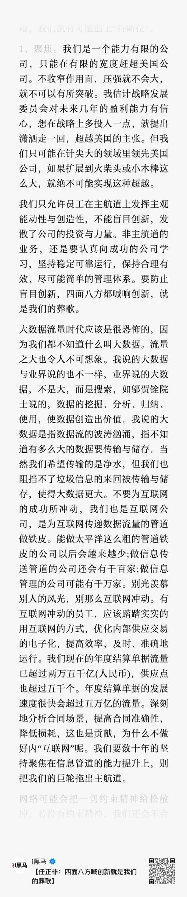 任正非:各个部门都在喊创新,口号太多了,就是华为公司的葬歌