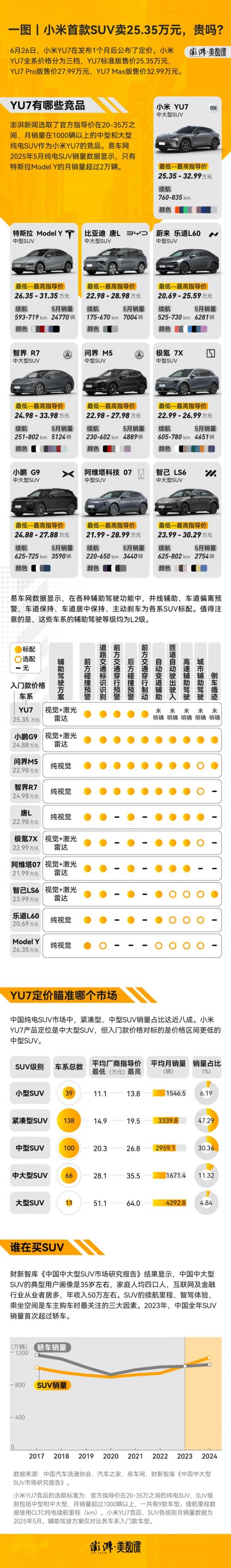 6月26日,外界期待已久的小米YU7正式发布,其标准版定价25.35万元,Pro版本27.99万元,Max版本32.99万元。