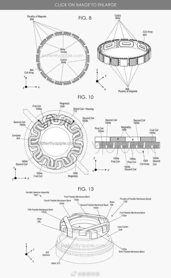 博文介绍,苹果的专利申请描述了一种可变光圈系统,主要面向紧凑型相机模块,适用于智能手机等设备,摒弃了传统的机械叶片,转而使用柔软、灵活的薄膜,这种弹性薄膜支持拉伸,通过扭曲和弯曲以打开或关闭光圈。