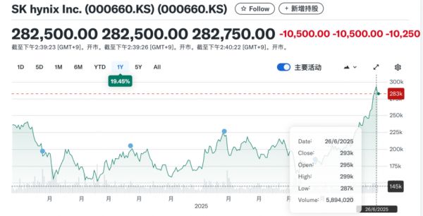 SK海力士的市值更是在短短一年半内翻了一番,6月24日,SK海力士市值突破200万亿韩元(1470亿美元),成为继三星电子之后,韩国历史上第二只突破200万亿韩元大关的股票。相比之下,三星电子的市值为358.13万亿韩元。
