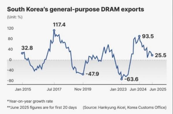 韩国作为全球DRAM产业的核心基地,其出口数据是观察行业周期的风向标。自今年2月起,韩国DRAM出口额结束此前的同比下滑态势,连续四个月实现两位数增长:3月增长27.8%,4月增长38%,5月增长36%,6月前20天增长25.5%。