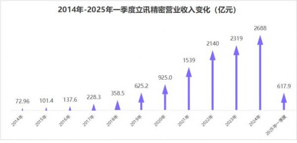 2014-2024年间,立讯精密的营收也从73亿成长至2688亿。