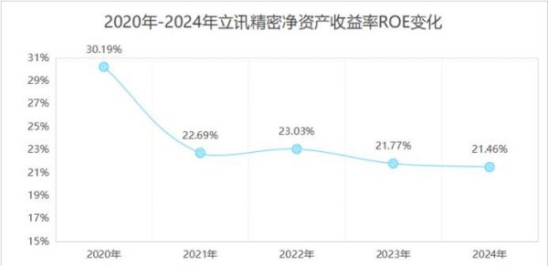 实则不然,立讯精密是一家非常会“赚钱”的公司,这从净资产收益率ROE中可见一二。ROE又叫股东权益报酬率,ROE为20%,说明股东投入100元,公司能为其带来20元的报酬。